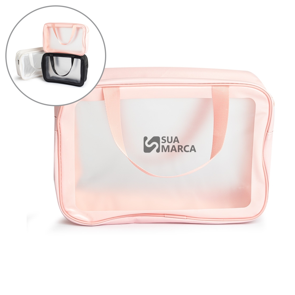 Descrição: Nécessaire de PVC e PU resistente à água, com duas alças laterais de mão.