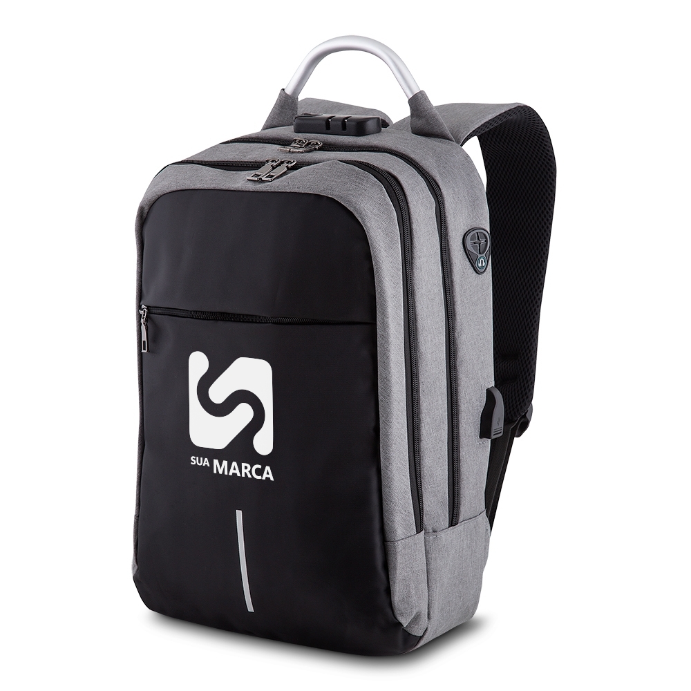 Descrição: Mochila anti-furto com cadeado de segredo. Material de poliéster cinza, tem a parte frontal à prova d’água (respingos). Compartimento principal com bolso para notebook e bolso de tela, parte externa com cadeado de segredo para trava dos zíperes; bolso médio com pequenas divisórias e bolso frontal com fita reflexiva. Possui entrada para fone de ouvido, suporte com entrada USB na parte externa e cabo USB acoplado internamente; permitindo a conexão de um carregador portátil na área interna e a conexão de um eletrônico na área externa, viabilizando a carga e utilização do eletrônico enquanto caminha. Alças para as costas ajustáveis revestidas com espuma para um maior conforto, alça para mãos em metal e alça horizontal para encaixe em malas de viagem. Utilização do cadeado: para criar um segredo pressione e segure o botão, crie a numeração desejada e em seguida solte o botão para assumir a codificação criada, repita o mesmo processo sempre que necessitar fazer alguma alteração.