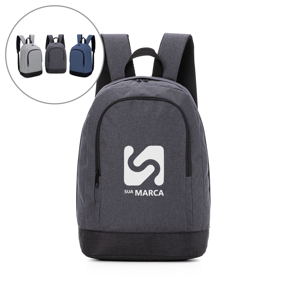 Mochila p/ Notebook em tecido poliéster. Parte externa: Bolsos frontal com ziper, Alça de ombro acolchoada e Alça de mão. Parte interna: Compartimento acolchoado p/ notebook.