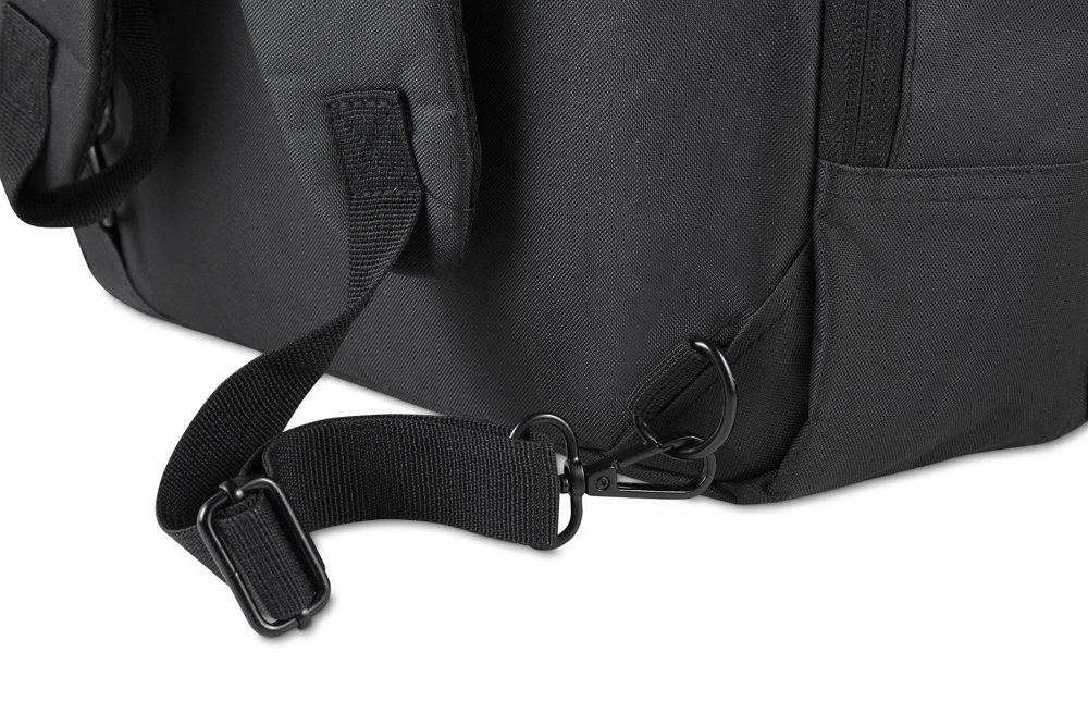 Mochila/pasta em poliéster 300D com detalhe em PU e interior em poliéster 210D. Possui alças lateral e de ombro acolchoadas, alça de mão, engate para mala de viagem, bolso frontal com zíper, compartimento interno para notebook até 15,6” e bolso traseiro para ocultar as alças.