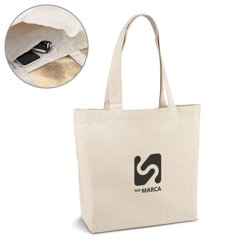 Sacola. 100% algodão canvas: 280 g/m². Com bolso interior e alças de 65 cm. 450 x 380 x 105 mm.