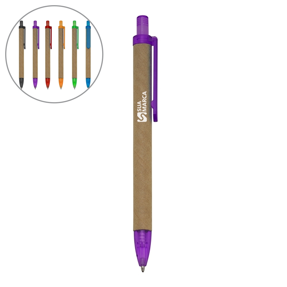 Descrição: Caneta de papelão com detalhes plásticos translúcidos, carga esferográfica azul e acionamento por clique.