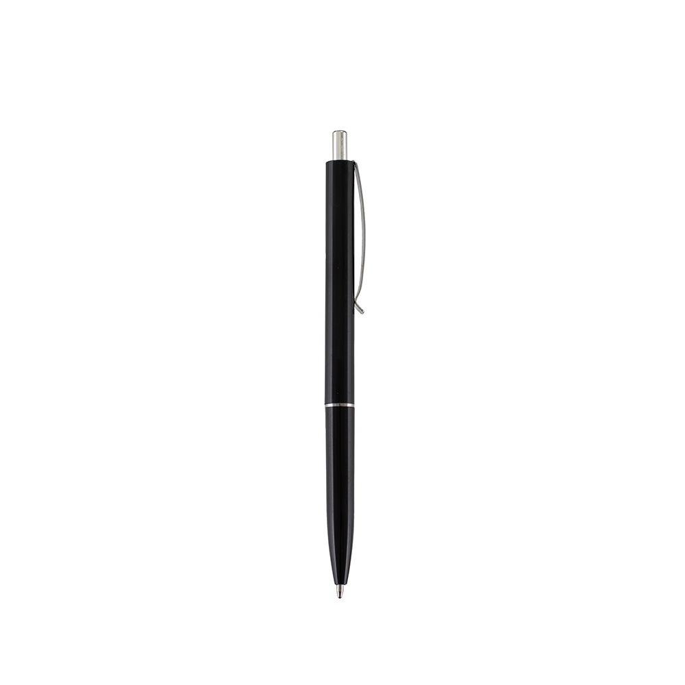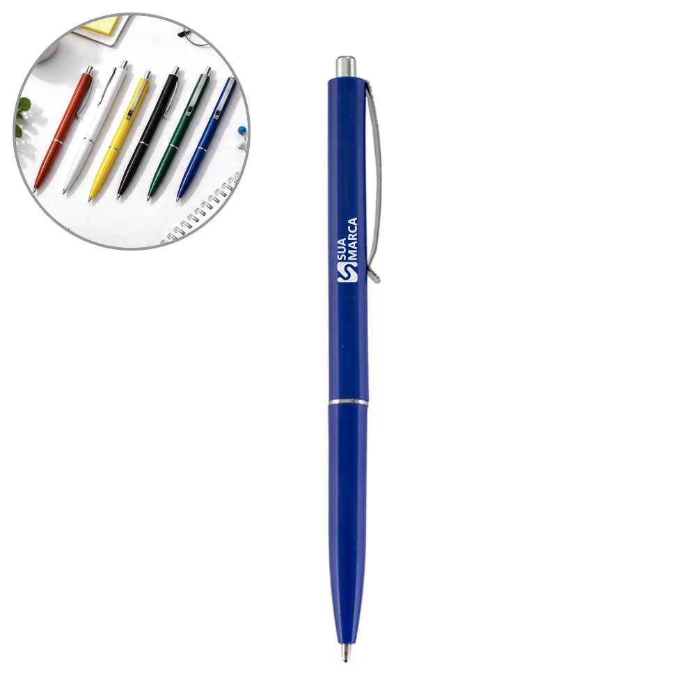 Caneta plástica com clip e ponteira em metal. Possui acionamento por clique e carga esferográfica azul de 1.0mm.