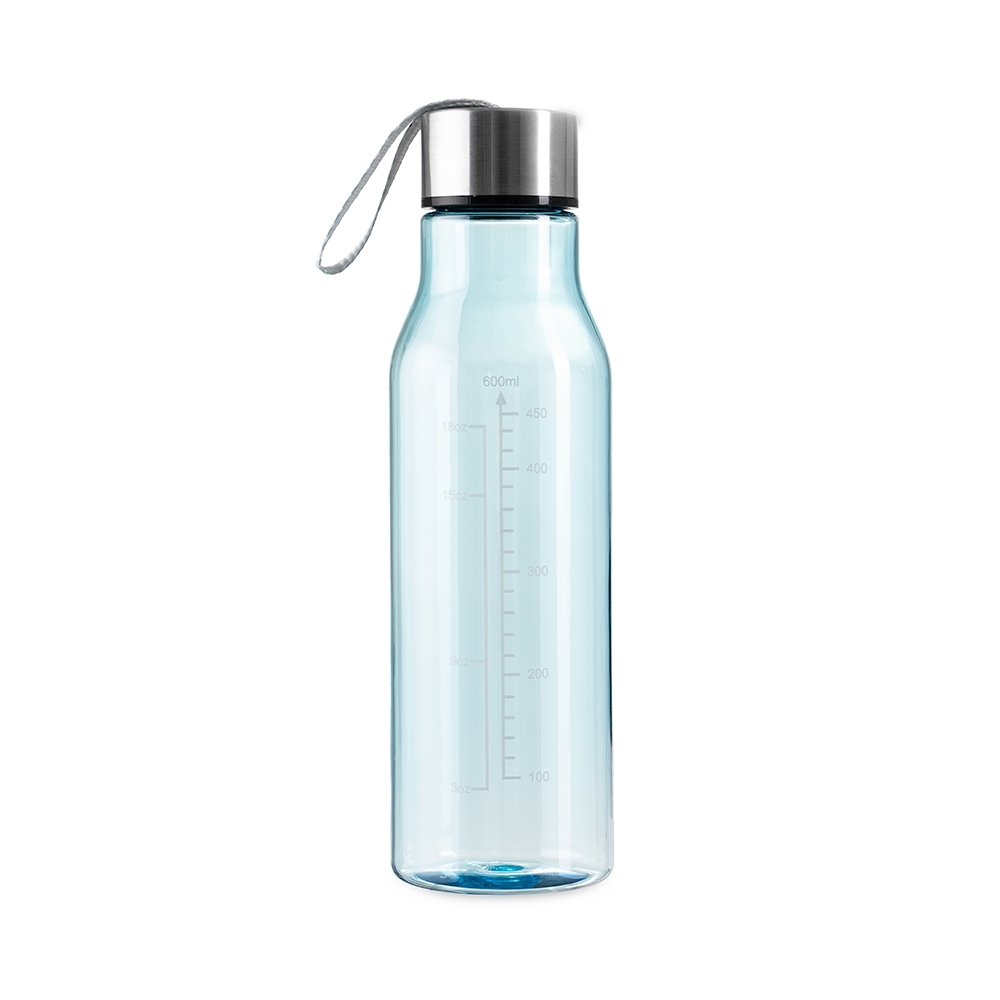 Descrição: Garrafa plástica com capacidade máxima de 615ml e marcação de volume de 600ml. Possui tampa rosqueável em alumínio com alça de nylon para transporte.