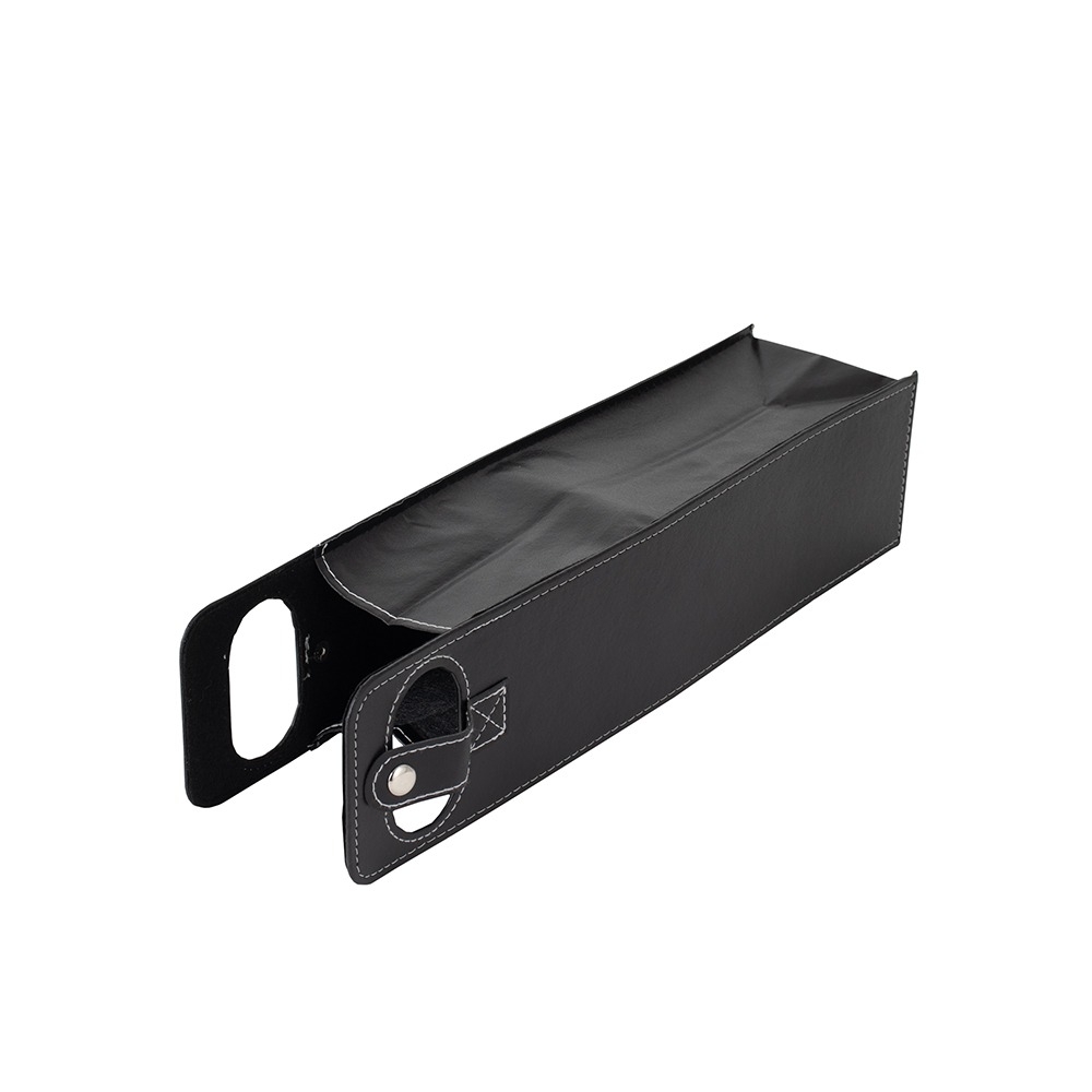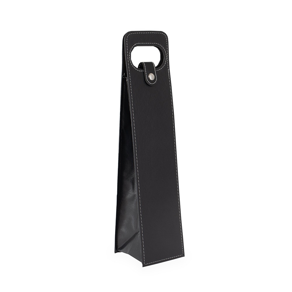 Descrição: Porta-vinho confeccionado em couro sintético e estrutura interna em papelão. Possui alça de mão vazada e fechamento em botão metálico.
