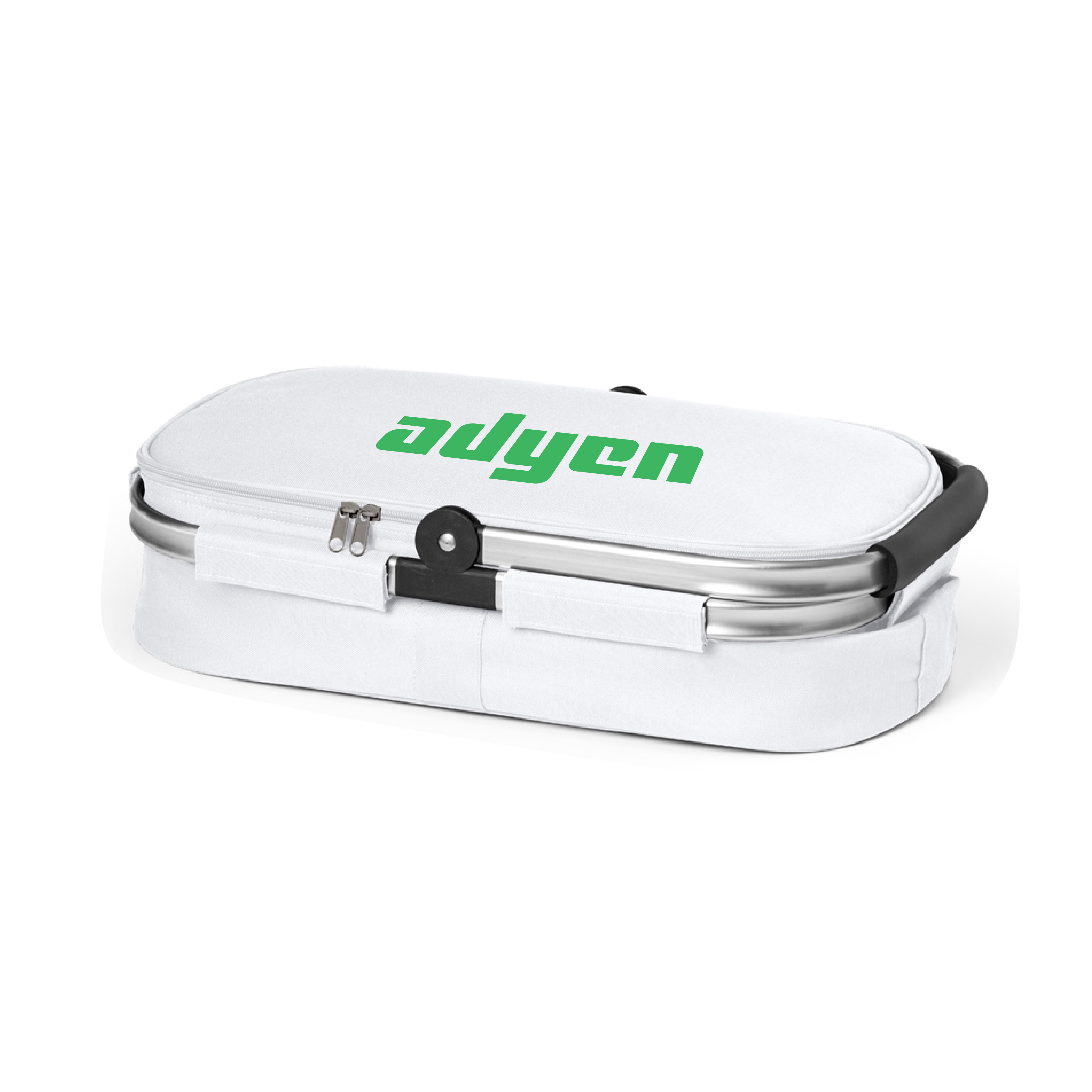Sacola térmica flexível. 600D. Com zíper duplo e interior forrado. Estrutura removível em alumínio, com pega ergonómica em EVA. Capacidade até 14 L. Food grade. 460 x 270 x 250 mm.