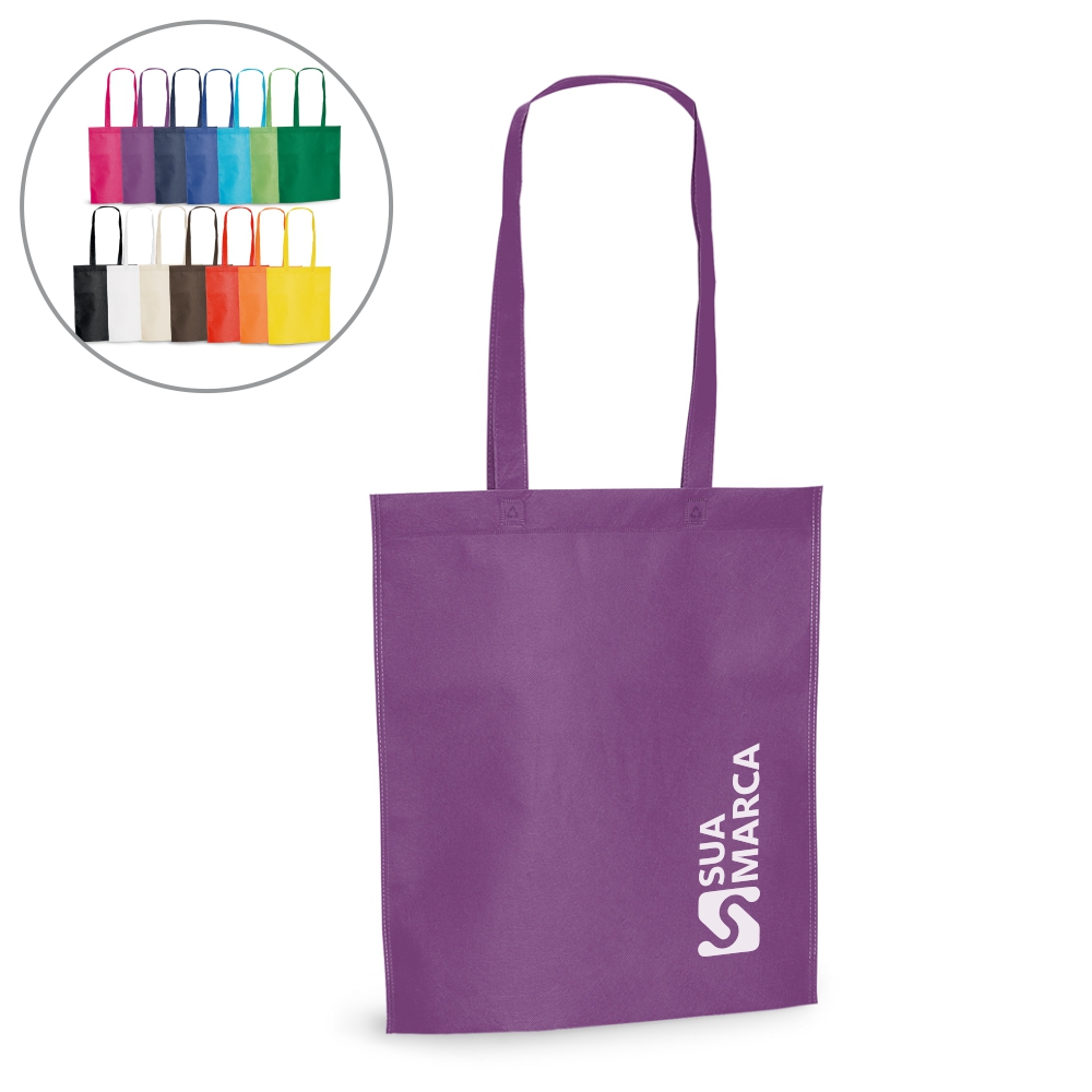 Sacola. Non-woven: 80 g/m². Termo-selado. Alças de 75 cm. 380 x 415 x 85 mm.