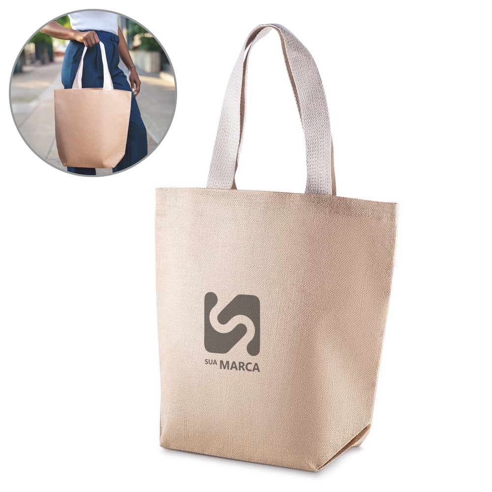 Sacola em Juta 360g/m² com alça em algodão cru e base plana.