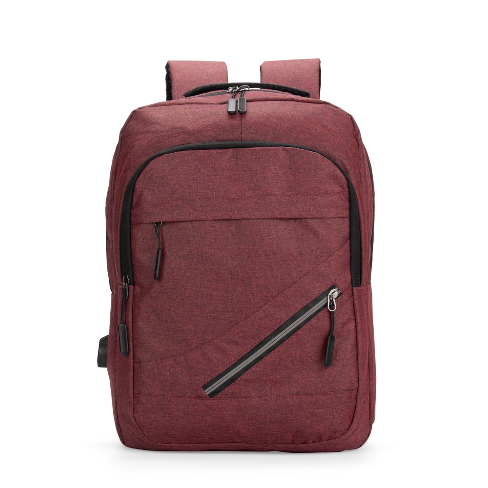 Mochila em tecido Oxford resistente à água com capacidade máxima de 18 litros. Possui compartimento principal com quatro bolsos pequenos e divisória acolchoada para notebook de até 15,6 polegadas. Apresenta um compartimento frontal e dois bolsos em tamanhos diferentes, um deles com faixa refletiva na área do zíper, além de um bolso e um adaptador USB posicionados em laterais opostas.