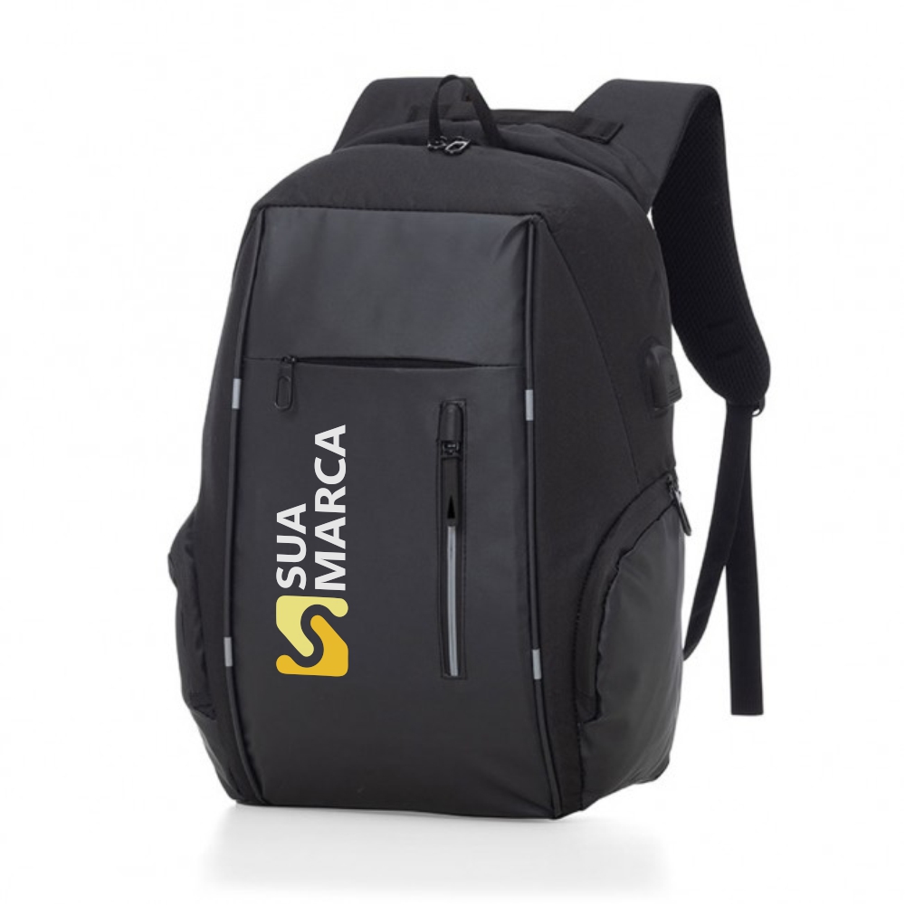 Descrição: Mochila confeccionada em poliéster com compartimento para notebook. Contém compartimento grande com bolso para notebook até 17 polegadas, compartimento mediano com zíper bolso frontal com zíper, alça de mão, alça superior em nylon, alças de ombro e costas acolchoada com revestimento antitranspirante, bolsos laterais com zíper e porta USB lateral. Tecido impermeável.