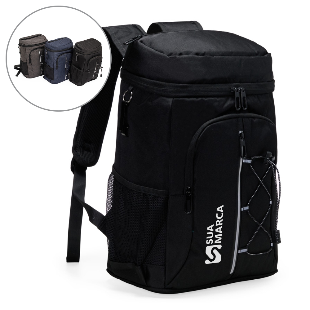 Descrição: Mais que uma bolsa térmica, ela possui uma capacidade de 32 litros e alças que permitem carregá-la nas costas. Fabricada em oxford, é resistente à água e conta com dois compartimentos: um com revestimento térmico em PEVA atóxico, ideal para manter a temperatura dos alimentos, e outro opcional para frutas, iogurtes, saladas e o que mais você precisar ao longo do dia. Nas laterais, há dois bolsos de tela para garrafas e outros itens de fácil acesso. Na parte frontal, são dois bolsos, sendo um deles com faixa refletiva e elástico ajustável. Para torná-la ainda mais completa e eficiente, inclui um chaveiro abridor de garrafas para usar sempre que precisar!
