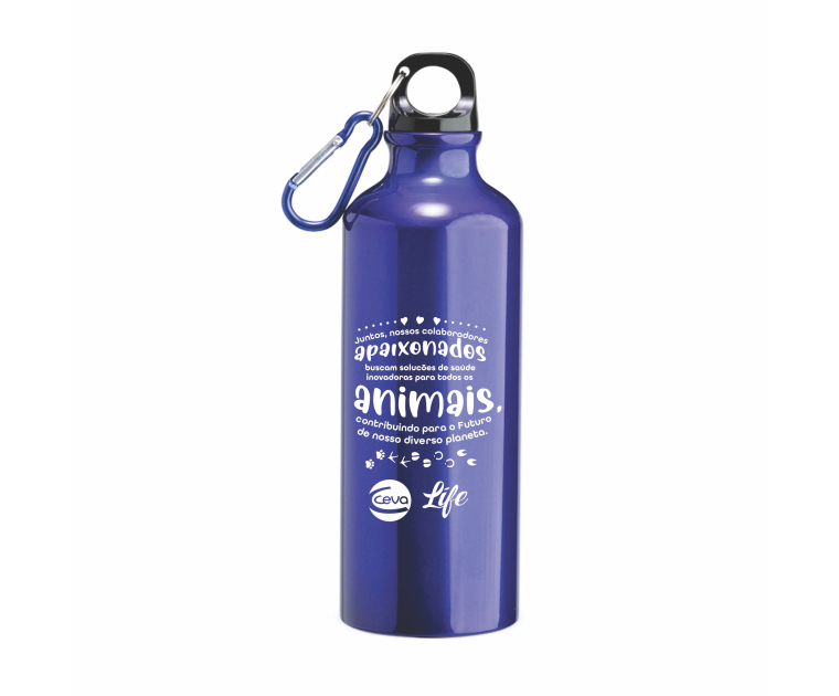 Squeeze 500ml de alumínio com pintura metalizada, tampa rosqueável e acompanha um segundo bico com mosquetão (não é térmico).