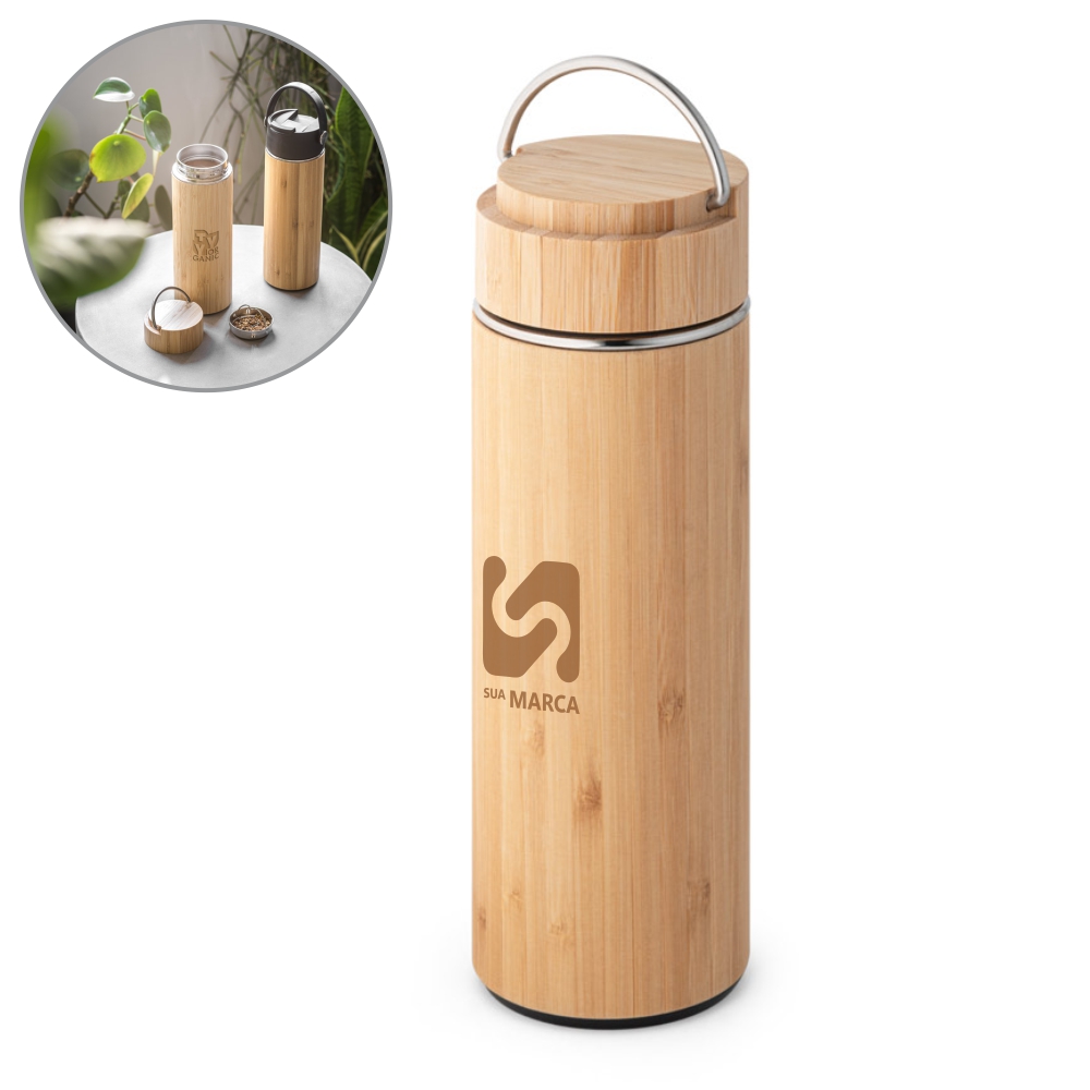 Squeeze em bambu e aço inox, com corpo duplo e isolamento a vácuo. Capacidade até 440 ml. Food grade. Fornecido em caixa presente de papel craft. ø70 x 215 mm.