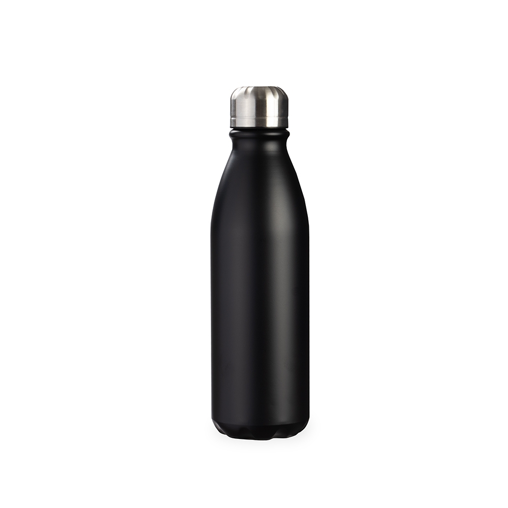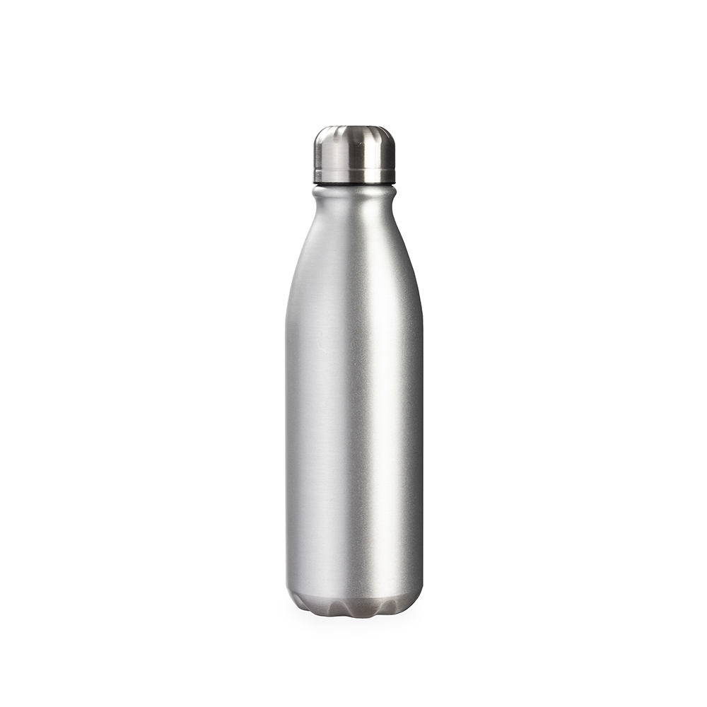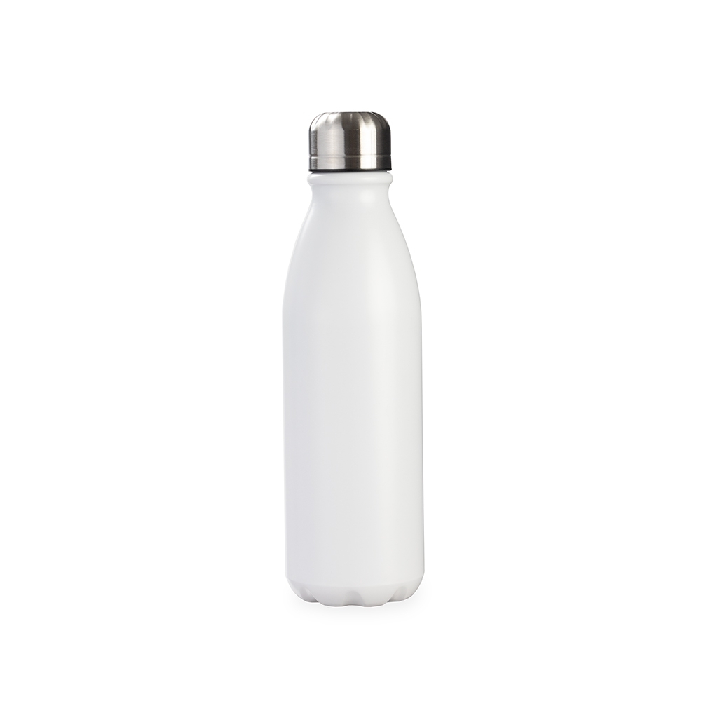 Garrafa em alumínio com acabamento em verniz fosco, revestimento plástico no bocal e capacidade para até 750ml. Possui tampa rosqueável em alumínio com interior em plástico.