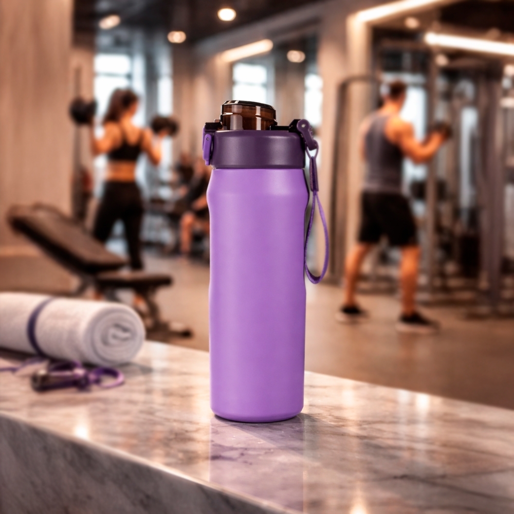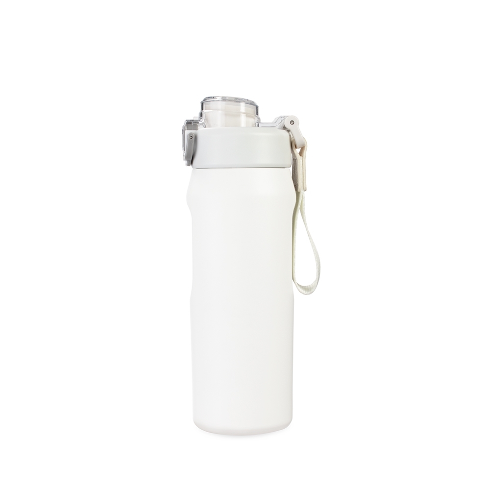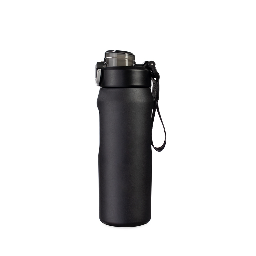 Sua tampa é rosqueável em plástico, com protetor para o bocal e para o bico suporte do canudo, além de trava de segurança que impede a abertura do protetor. Conta com base antiderrapante para maior estabilidade, alça de PVC com fibra sintética e acompanha canudo de silicone para encaixe interno na tampa.
