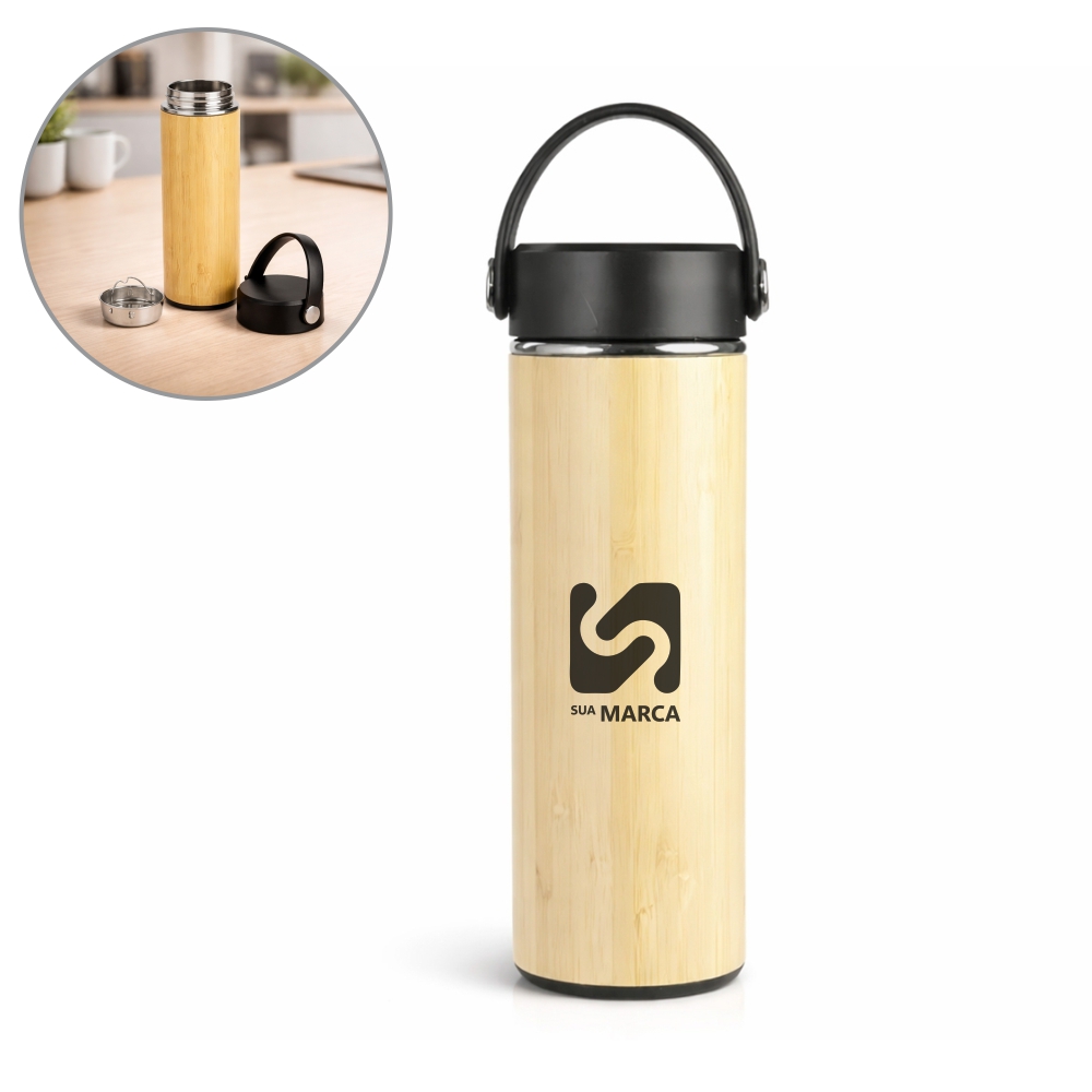 Descrição: Garrafa térmica com capacidade máxima de 400ml. Possui estrutura de parede dupla com revestimento externo em bambu e parte interna em inox 304. Conta com tampa rosqueável em polipropileno (PP) com alça para transporte. Acompanha cesto infusor com alça em inox 304.