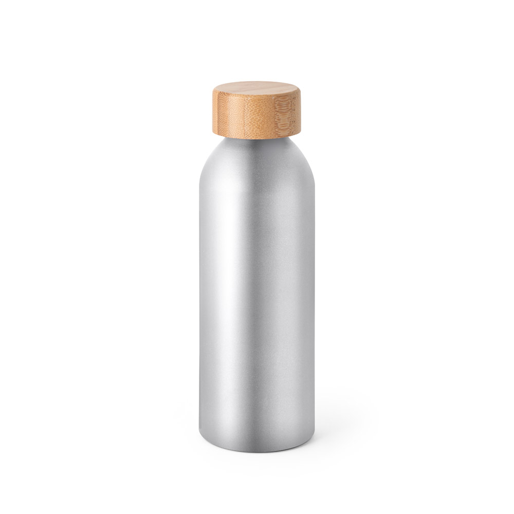 Squeeze de alumínio com acabamento mate e tampa em bambu. Capacidade até 550 ml. Food grade. Caixa branca 94656 vendida opcionalmente. ø65 x 197 mm.