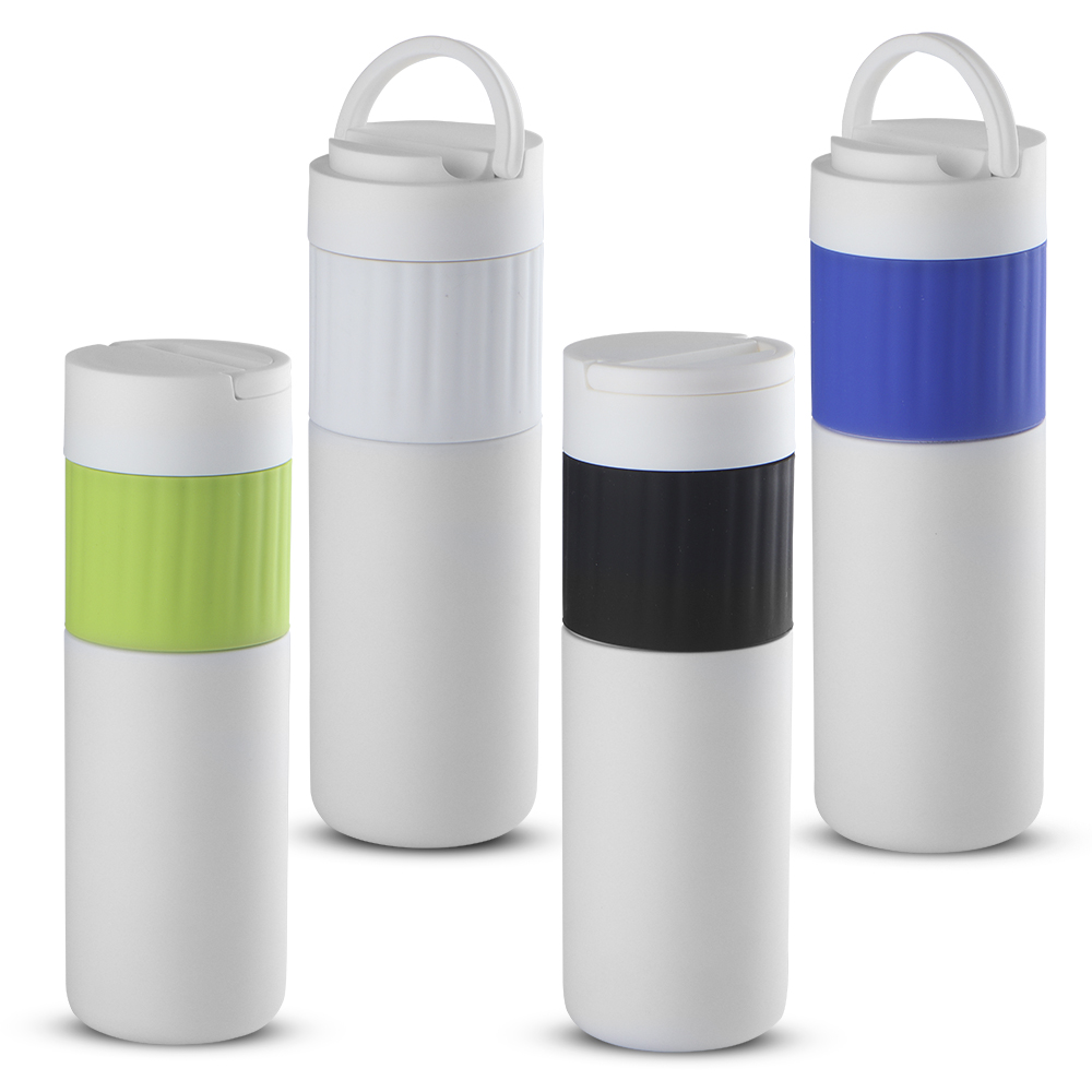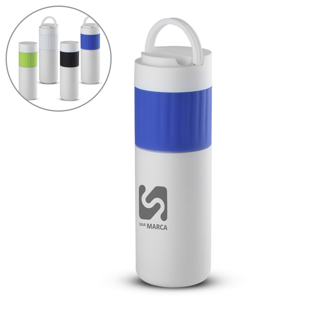Conserva a temperatura quente ou fria, com alça e suporte para celular na tampa. Apoio para mão emborrachado e tampa rosqueável com anel de silicone para vedação.