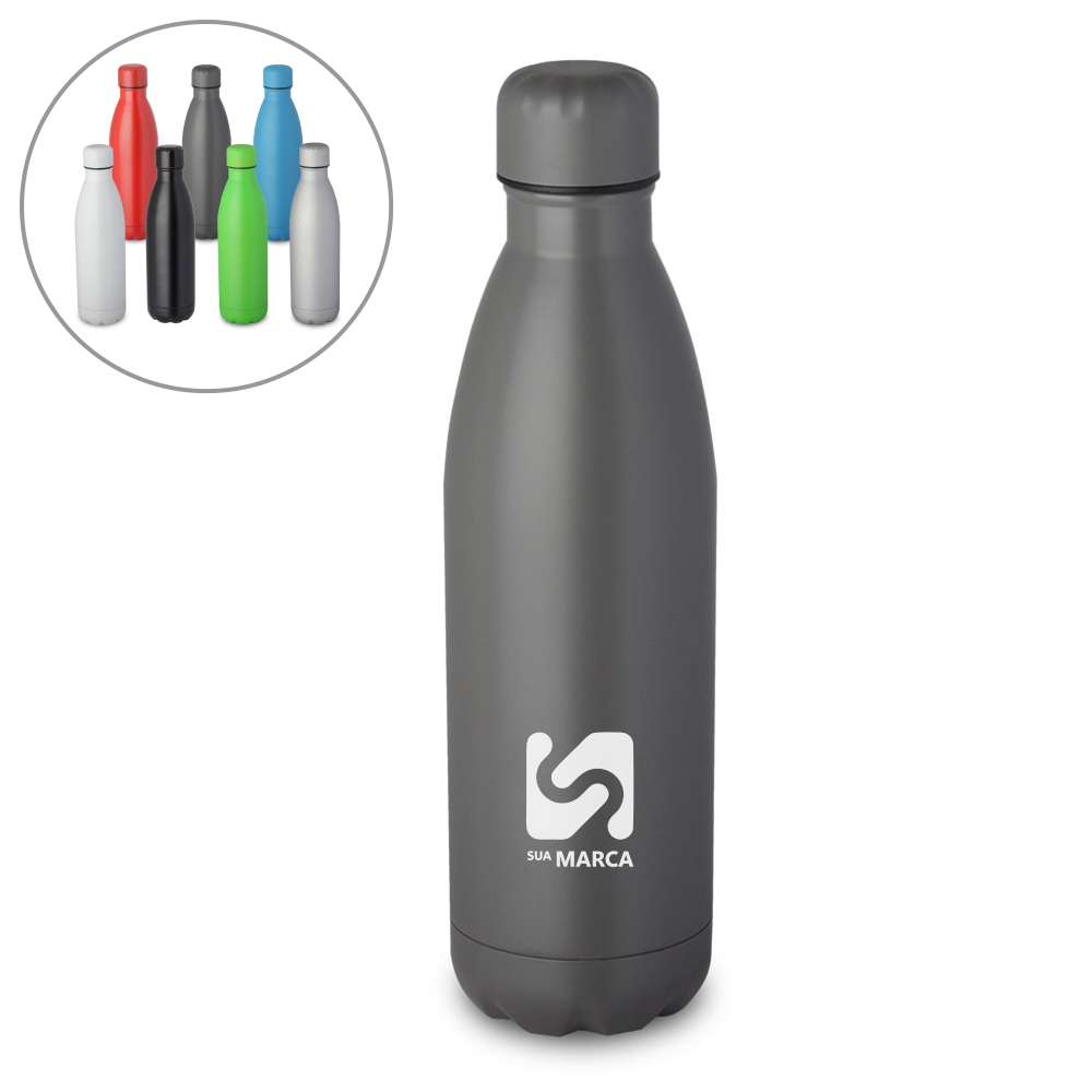 Garrafa fosca em aço inox com capacidade de até 750 ml. Tampa rosqueável e anel de silicone para vedação. Design com frisos na tampa.