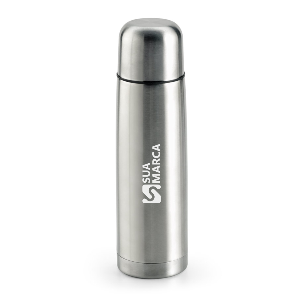 Garrafa em aço inox com parede dupla isolada a vácuo. Capacidade até 500 ml. Fornecida em caixa. ø69 x 240 mm.