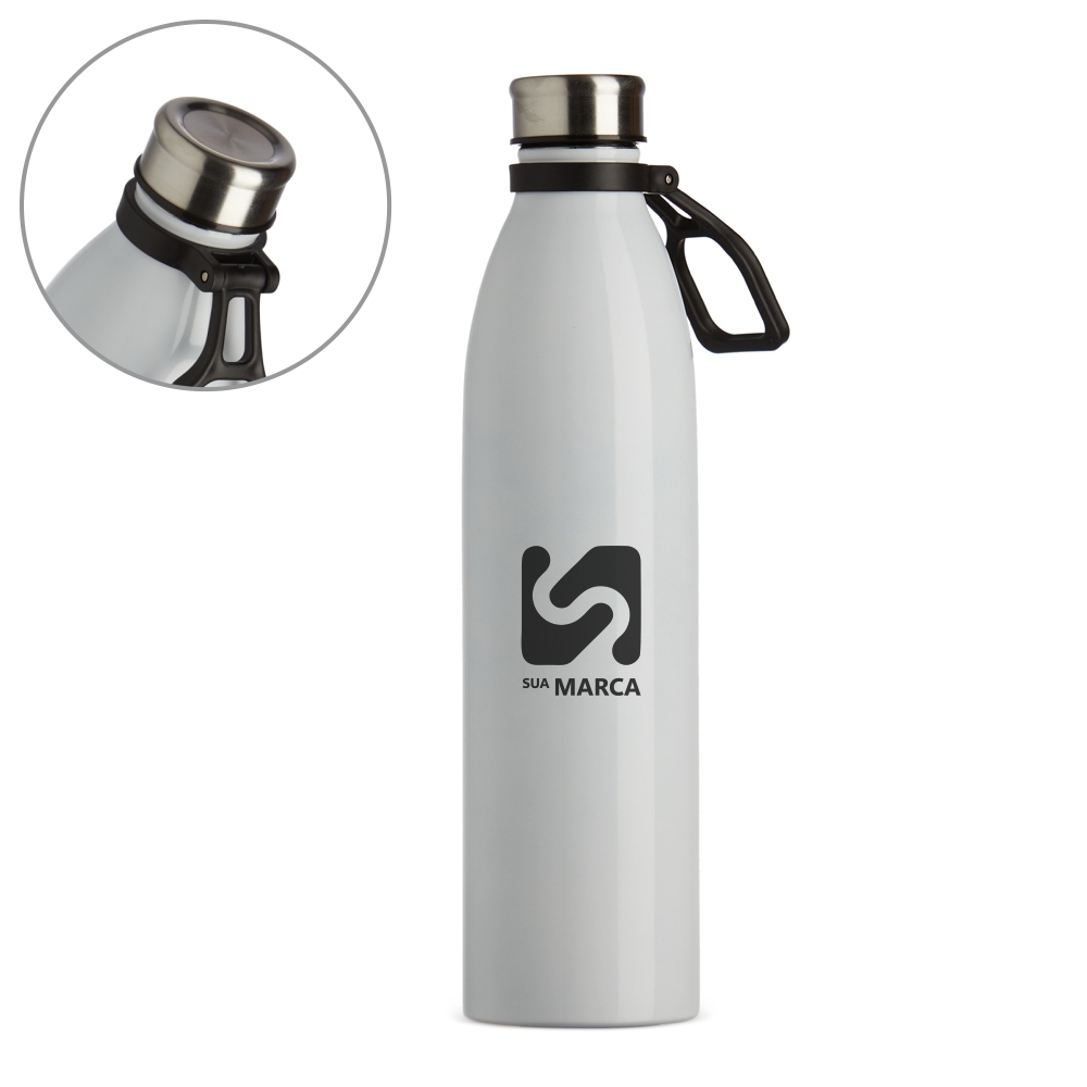 Descrição: Garrafa de inox 1,1 litros com tampa rosqueável e alça plástica para transporte.