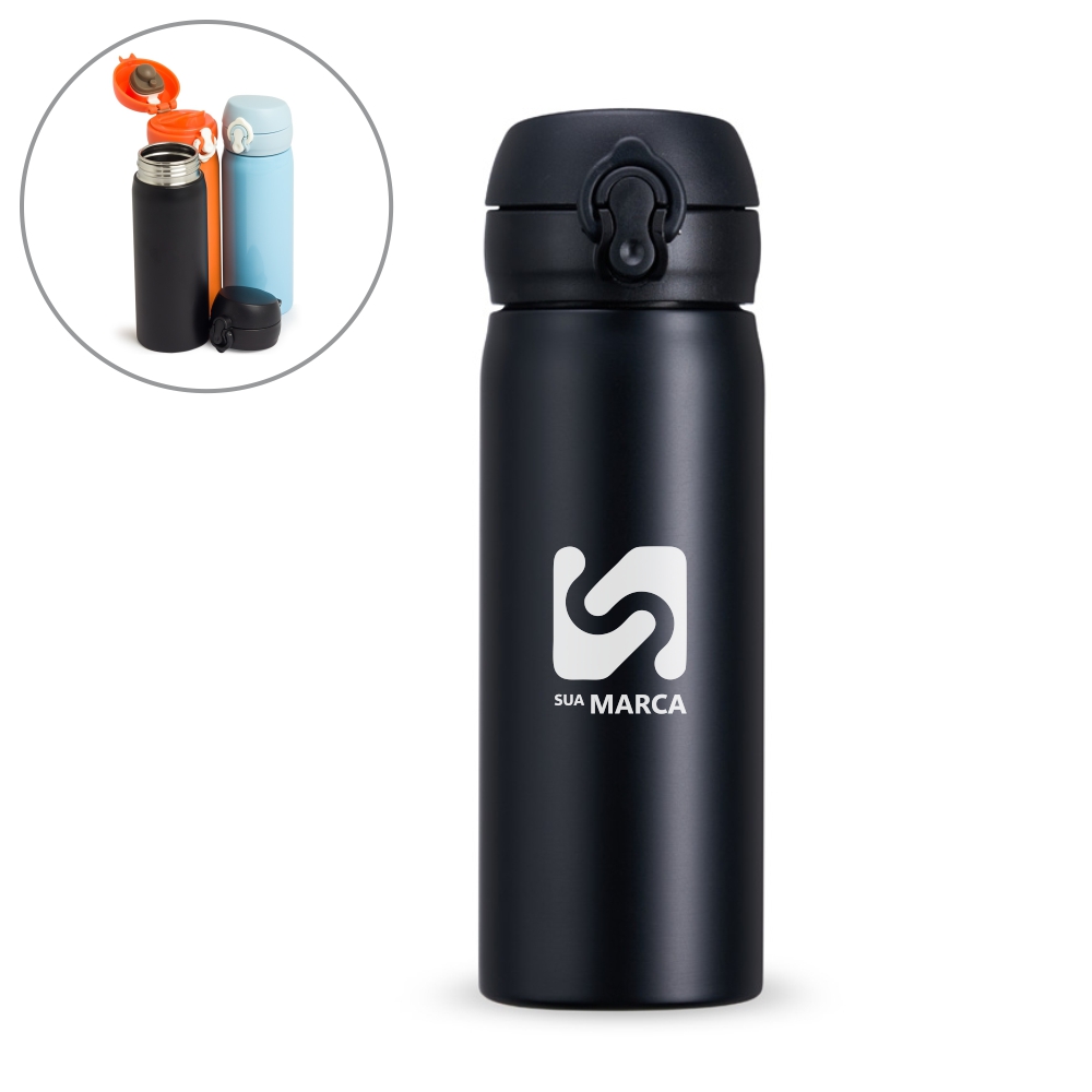 Descrição: Garrafa 500ml em inox com botão e válvula para abertura. Possui um sistema de trava (basta mover para cima/baixo para abrir/fechar) pressione o botão central para abrir a tampa.