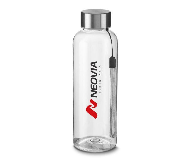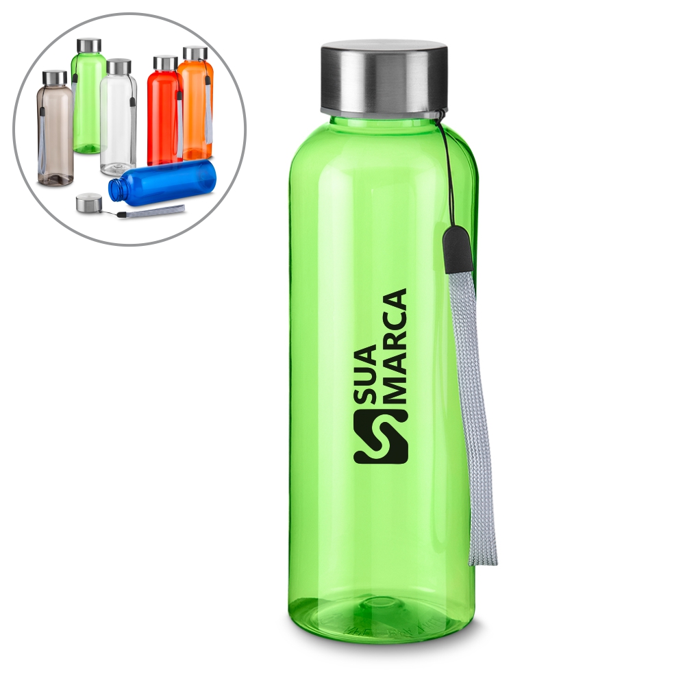 Garrafa *RPET com capacidade de até 500ml com alça em cordão e tampa de metal.