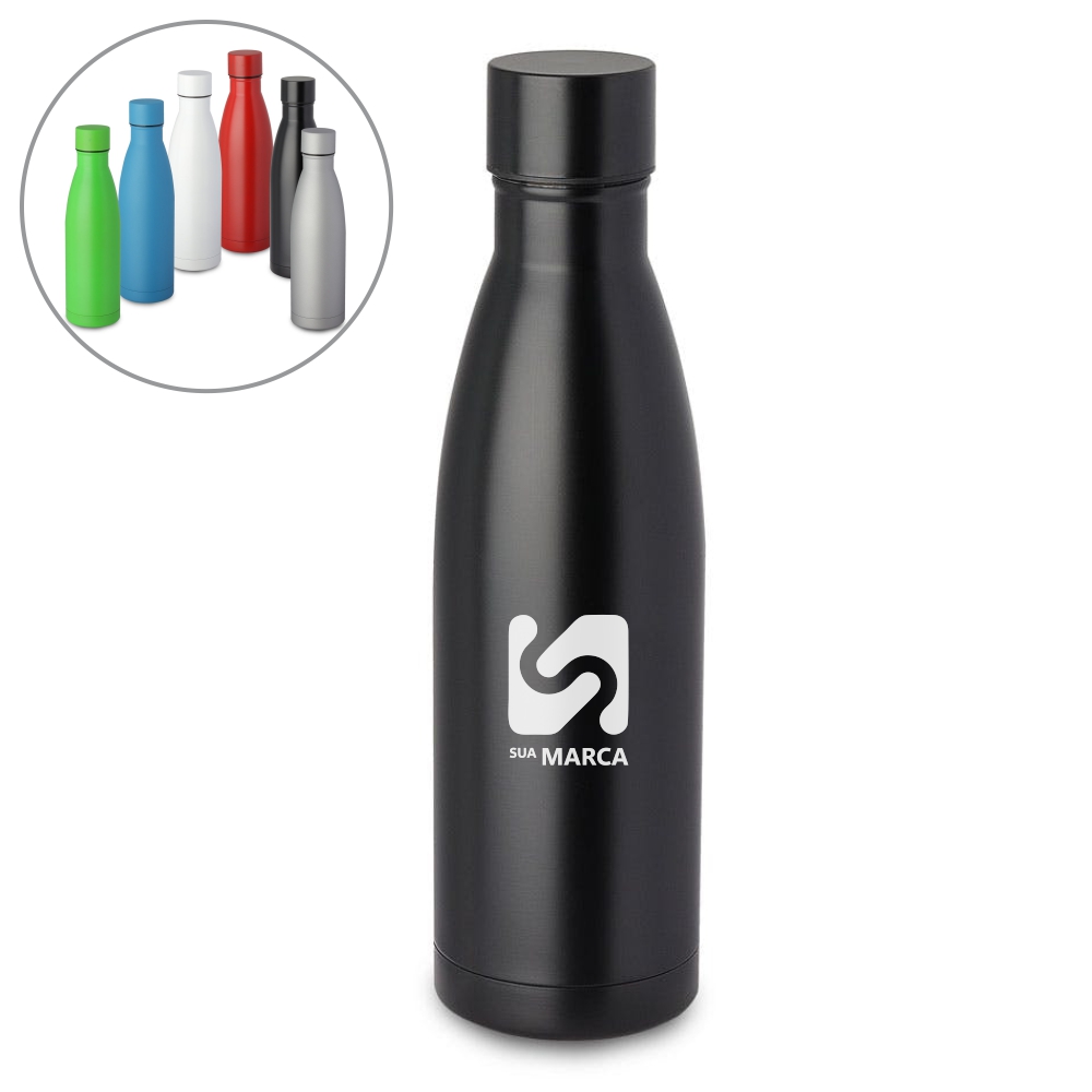 Garrafa térmica em aço inox com parede dupla isoladao à vácuo, com tampa de inox na cor do produto e anel de silicone para vedação. Capacidadede até 500ml, pintura fosca.