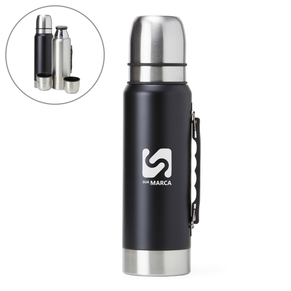 Garrafa térmica de inox com parede dupla e tampa dupla, capacidade de 1 litro. Com alça plástica para transporte, a garrafa contém duas tampas utilizáveis como copos.