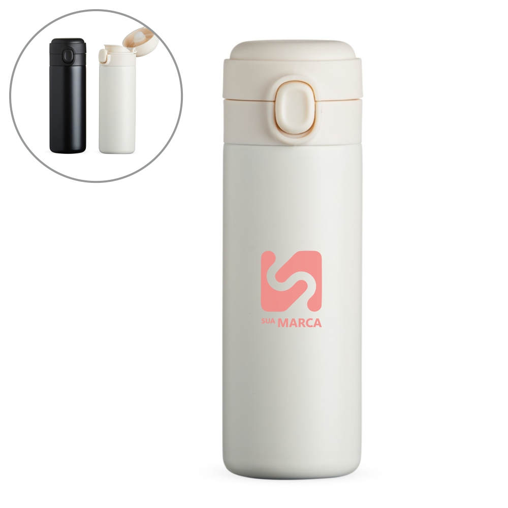 Garrafa térmica em inox com parede dupla, capacidade de 410ml. Tampa com botão central para abertura e borracha interna para vedação.