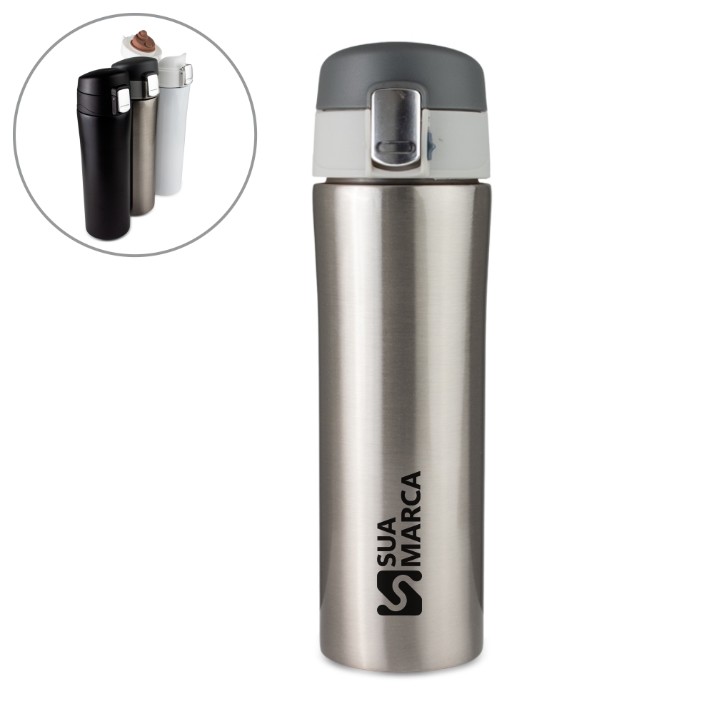Descrição: Garrafa térmica de 450ml, prática e segura! Feita em inox 304, com parede dupla que mantém a temperatura do líquido por mais tempo. Sua tampa plástica fosca possui vedação em borracha para evitar vazamentos e garantir proteção extra. Com botão central para abertura e trava lateral intuitiva, basta seguir os ícones de cadeado para travar ou destravar a tampa com facilidade. Sinônimo de segurança e agilidade na hora de consumir bebidas!