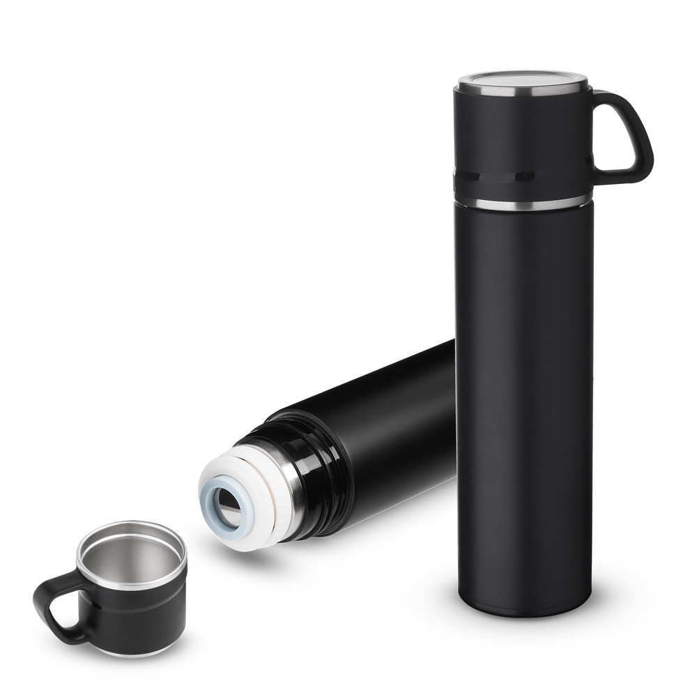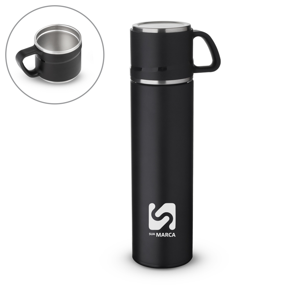 Garrafa térmica em aço inox com parede dupla isolada a vácuo, com capacidade de até 550ml. Tampa removível que possibilita o uso como caneca, anel de silicone para vedação.