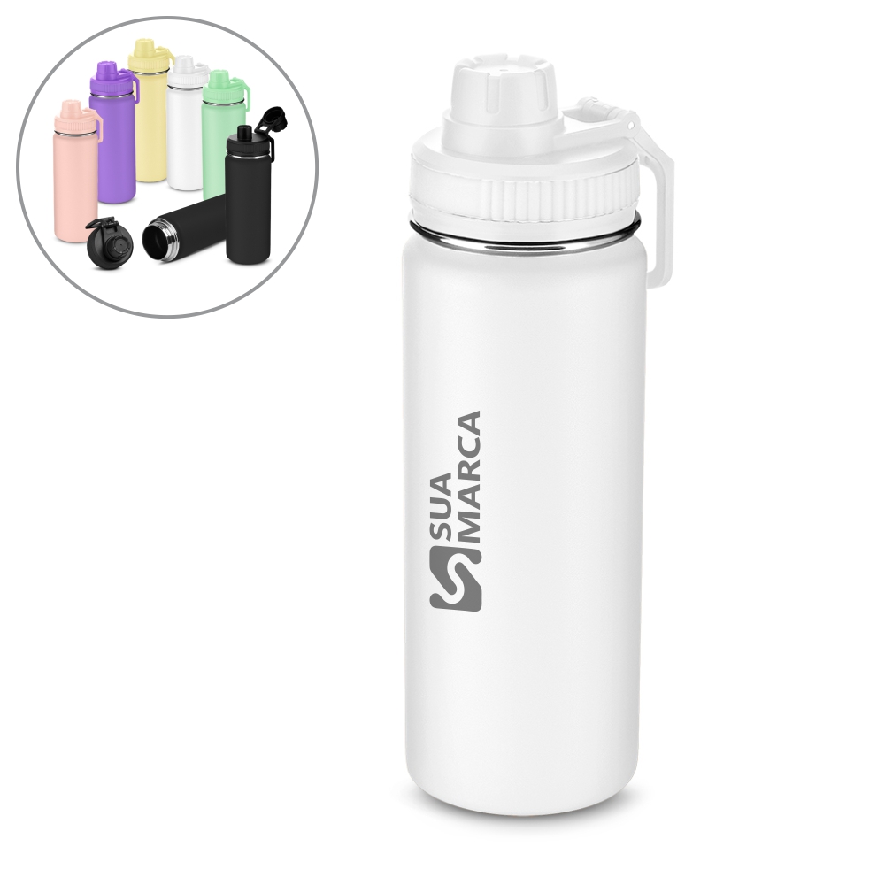Garrafa térmica em aço inox com parede dupla com capacidade de até 570 ml. Tampa rosqueável, mosquetão em plástico e anel de silicone para vedação. Design com frisos na tampa e pintura pó.