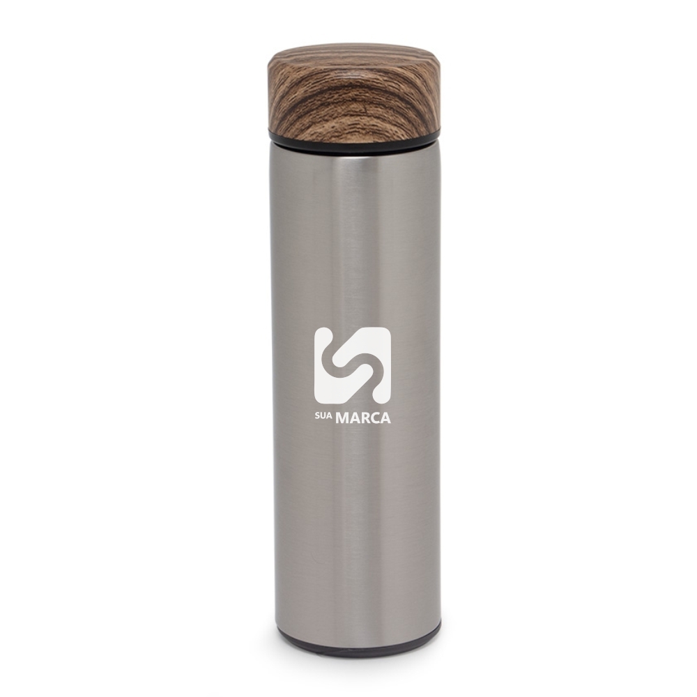Garrafa térmica 500ml em inox com parede dupla, infusor e tampa rosqueável com detalhe em madeira.