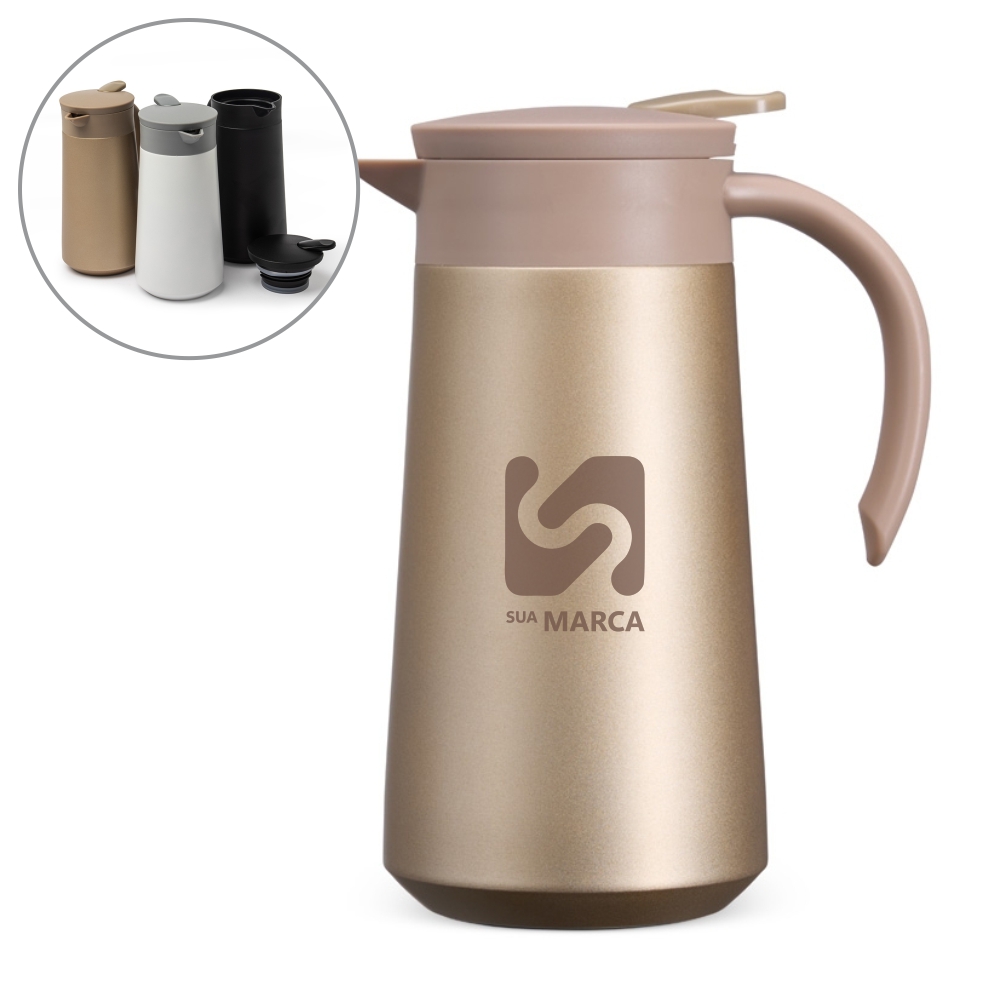 Descrição: Garrafa Térmica feita em Inox 304 com parede dupla e capacidade de 800m. Tampa rosqueável com alavanca que abre/fecha para servir a bebida.