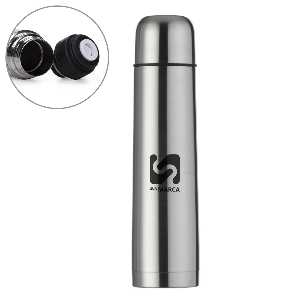Garrafa térmica 1L em inox com tampa rosqueável, tampa interna em plástico resistente(basta um clique para abrir ou fechar). Acompanha capa protetora de couro sintético com alça em nylon e detalhe vermelho.