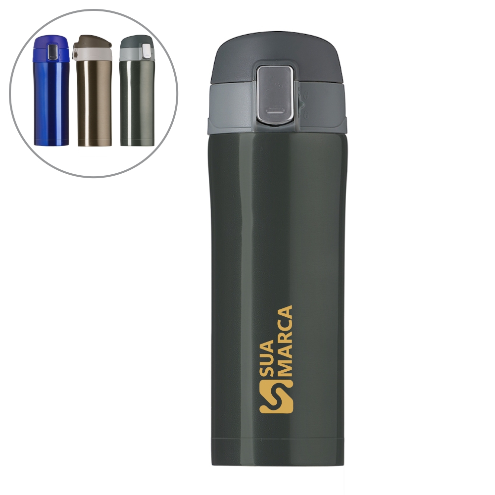 Garrafa térmica 350ml colorida com sistema de trava. Material metálico com revestimento interno em inox, possui tampa plástica fosca com borracha interna para vedação evitando o vazamento de líquido e prezando sua temperatura; possui botão central para abertura e trava lateral(basta seguir a orientação dos desenhos de cadeados simulando o travamento/destravamento da tampa).