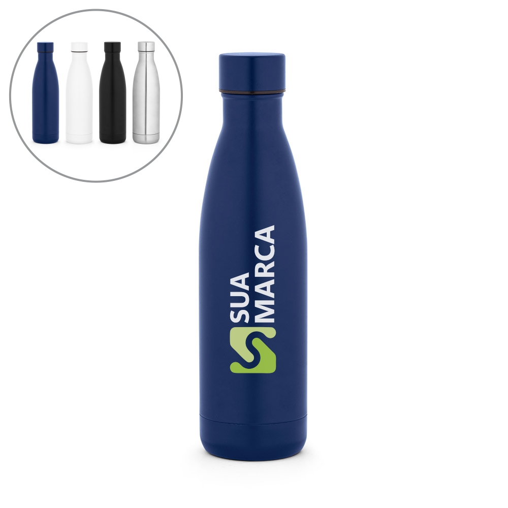 Garrafa em aço inox 90% reciclado de parede dupla térmica, isolada a vácuo. Garrafa com acabamento mate e tampa de rosca à prova de vazamentos. Capacidade até 810ml.