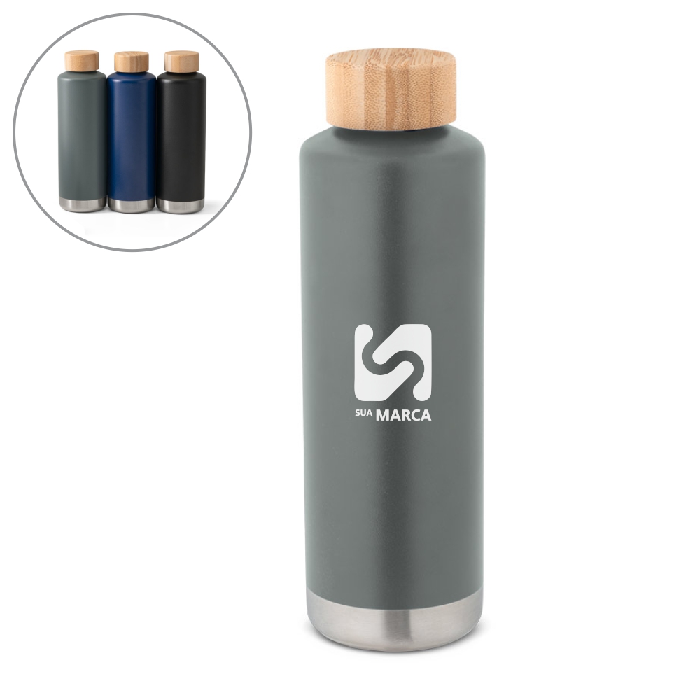 Squeeze em aço inox com parede dupla isolada a vácuo, parede interna revestida de cobre e tampa em bambu com vedante de silicone para proteção extra. Tem capacidade até 640 ml e mantém as bebidas quentes por 16 h e frias por 48 h. Contém revestimento em pó que lhe confere mais durabilidade e resistência. Food grade. Fornecido em caixa presente de papel craft. ø72 x 233 mm.