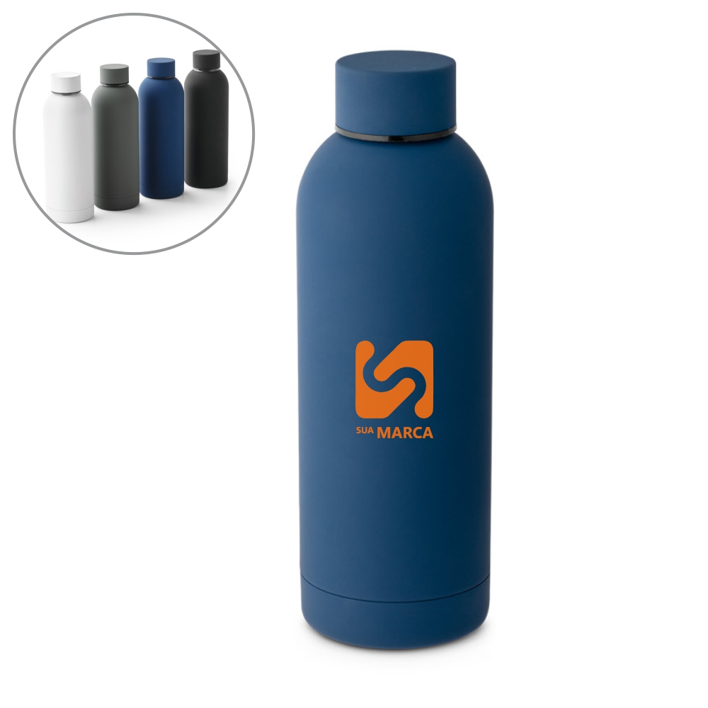 Squeeze em aço inox com acabamento em borracha, parede dupla isolada a vácuo e capacidade até 550 ml. Food grade. Fornecida em caixa de oferta. ø70 x 220 mm.