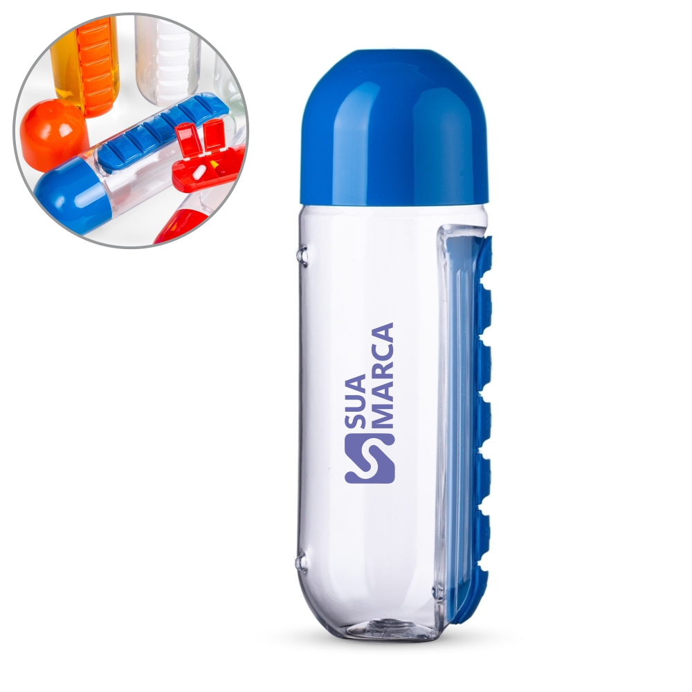Descrição: Squeeze 700ml plástico com porta comprimido. Garrafa transparente com encaixe para bandeja de comprimidos colorida, especificado por siglas referente os dias da semana, possui quatro “pézinhos” no qual auxiliam o squeeze a fica na posição horizontal. Tampa rosqueável colorida.