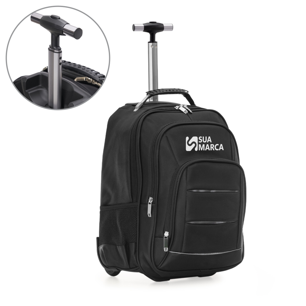 Descrição: Mochila de carrinho 42 litros com padrão para bagagem de mão, conforme especificações IATA (Associação Internacional de Transportes Aéreos). Confeccionada em nylon, contém alça de mão com pegador emborrachado com cabo de aço interno para garantir maior resistência, puxador retrátil com regulagem e botão acionador, alças para as costas escondidas no compartimento traseiro com zíper, compartimento mediano com divisórias para documentos e canetas, compartimento frontal pequeno e bolsos laterais em malha. O compartimento principal possui bolso para notebook até 13.3 polegadas e forro com zíper. Possui duas rodinhas e freio em plástico, além de um sistema velcro para junção do compartimento das alças com a parte inferior, tampando as rodinhas enquanto transporta a mochila nas costas.