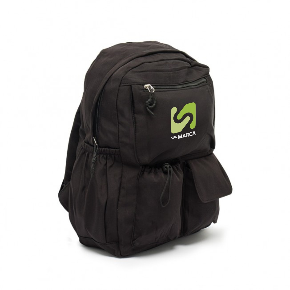Descrição: Mochila de poliéster de 25 litros com dois compartimentos, sendo o principal com um bolso raso para notebook de até 15,6 polegadas. A mochila possui um adaptador USB externo e quatro bolsos: dois laterais com elástico, um com velcro e um com cordão ajustável.