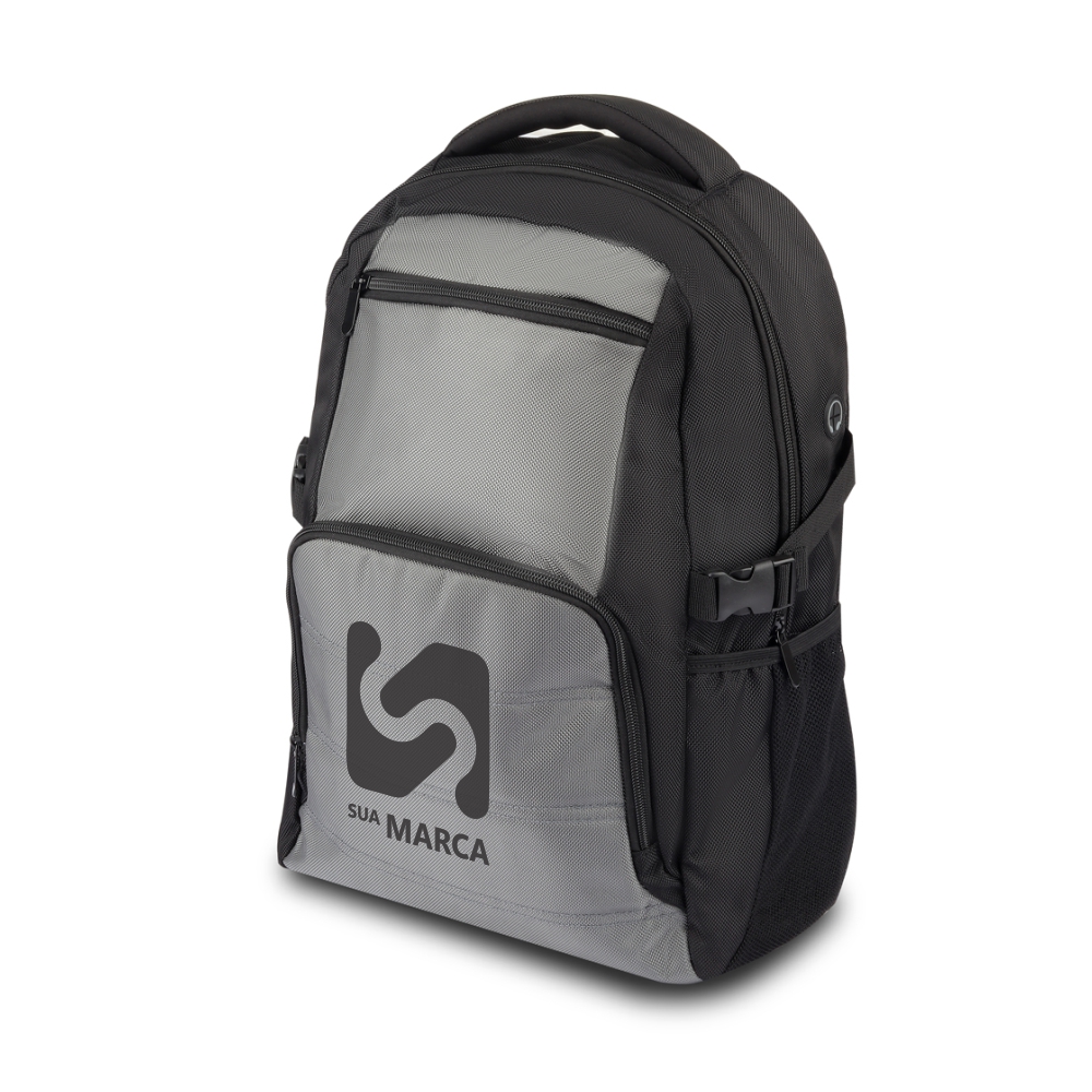 Parte externa: 1 compartimento, alça de mão e ombro acolchoado, saída USB e fone de ouvido, 2 bolsos frontais com zíper e 2 bolsos laterais.