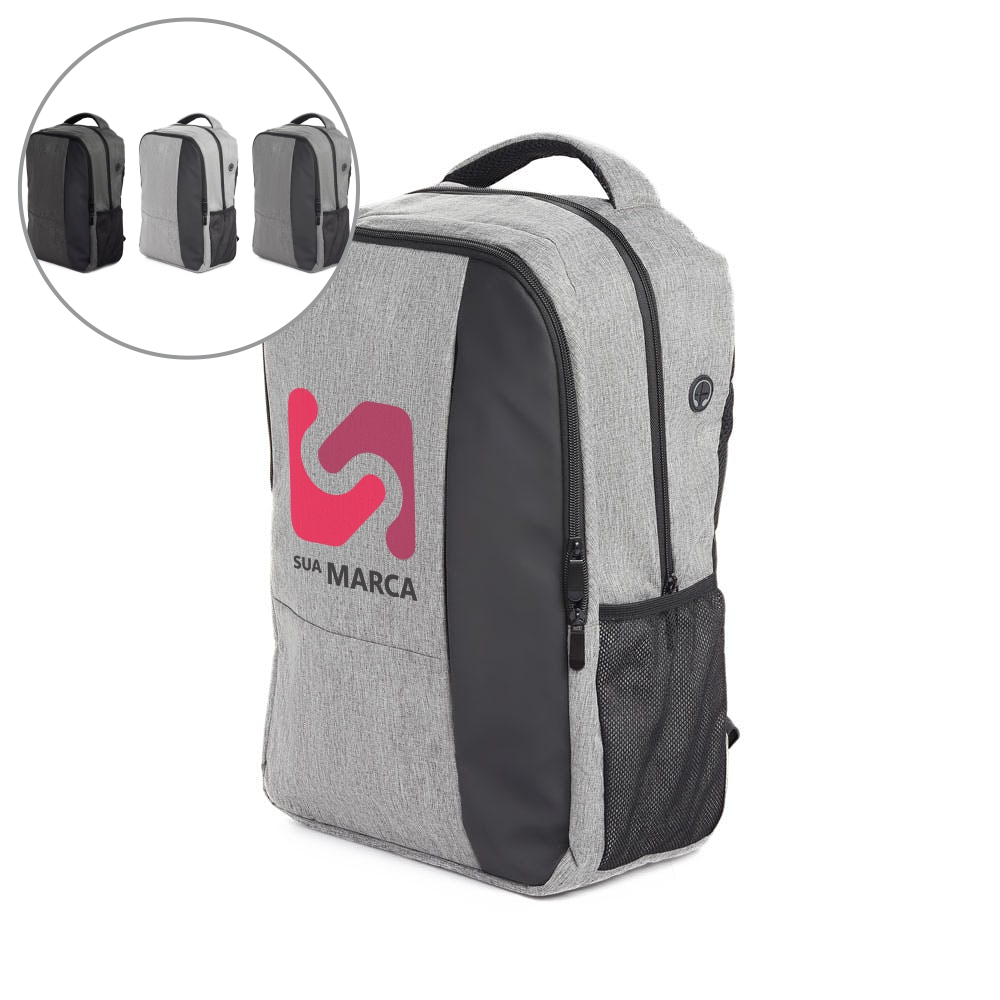 Parte externa: 2 compartimentos, 2 bolsos laterais. Saída USB e fone de ouvido. Alça de mão e ombro acolchoada.