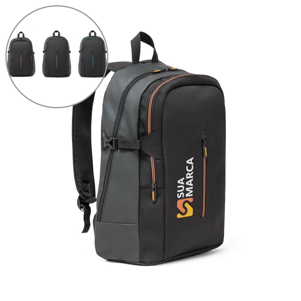 O compartimento posterior é forrado e tem divisória almofadada para notebook até 15,6" e bolso em tela, com zipper. O compartimento médio também é forrado e contém divesos bolsos interiores. A parte posterior e alças são almofadadas. 330 x 450 x 160 mm.