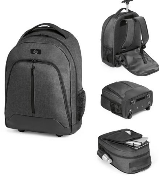 Mochila trolley para notebook. 600D de alta densidade e poliéster 600D impermeável. Para notebook até 15.6''. Bolso frontal com zíper e bolsos laterais com tela. Com protetor de rodas. Pega extensível em metal. Parte posterior e alças almofadadas. Placa metálica removível com imã, para fácil gravação. 340 x 430 x 170 mm.