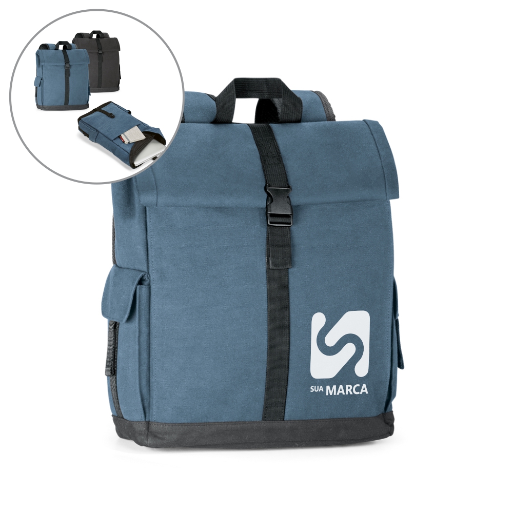 Mochila para notebook. Algodão canvas pré-lavado. Compartimento principal forrado, com 2 bolsos interiores e divisória almofadada para notebook até 15.6". Bolso frontal e 2 bolsos laterais. Parte posterior e alças almofadadas. 300 x 390 x 120 mm.