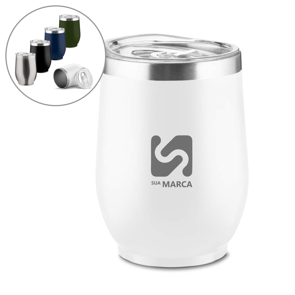 Copo térmico em aço inox com parede dupla, pintura fosca, detalhe em aço inox, tampa plástica com anel de silicone para vedação,abertura na tampa para consumo, capacidade de 350ml.