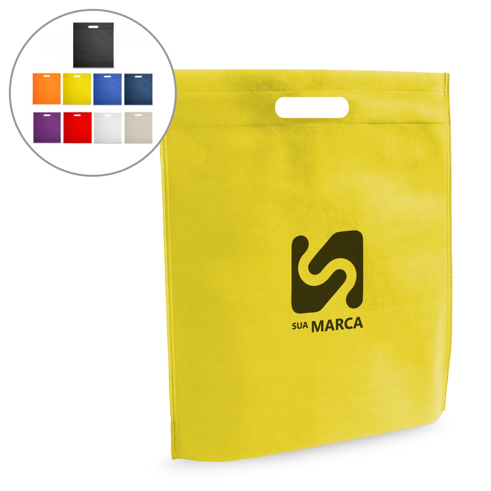 Sacola. Non-woven: 80 g/m². Termo-selado. 355 x 390 x 85 mm.